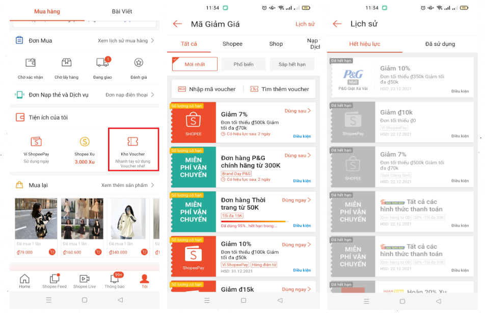 Các mã giảm giá đã được sử dụng và quá thời hạn sẽ hiện ở mục Tôi => trong mục Tiện ích của tôi, chọn Kho Voucher => Lịch sử