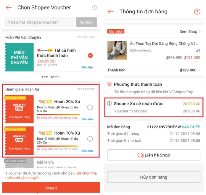 Khi sử dụng mã hoàn xu cho đơn hàng đủ điều kiện áp dụng, thì bạn sẽ nhận được một số xu tương ứng với giá trị hoàn lại của mã đó. Số tiền hoàn lại được tính theo % dựa trên giá trị đơn hàng không bao gồm phí vận chuyển. Nó sẽ được hoàn lại bằng Shopee xu thay vì tiền mặt.