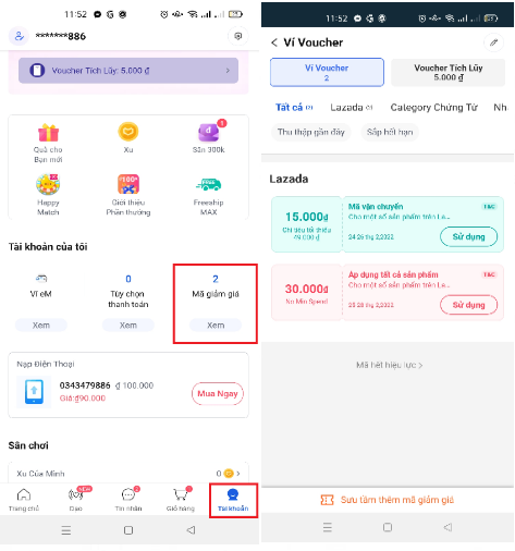 - Đối với ứng dụng, chọn vào mục Tài khoản. Tiếp tục truy cập vào mục Mã giảm giá. Bạn chọn mục Xem để kiểm tra cụ thể các mã Voucher mà bạn đã sưu tầm trong thời gian vừa qua.