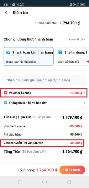 Sau khi bạn áp dụng mã freeship Lazada thành công, thông tin đơn hàng sẽ cập nhật số tiền được giảm phía bên dưới, đồng thời tổng số tiền phải trả cũng sẽ giảm đi.