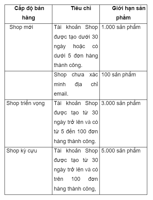 Giới hạn đăng bán sản phẩm trên mỗi gian hàng Shopee