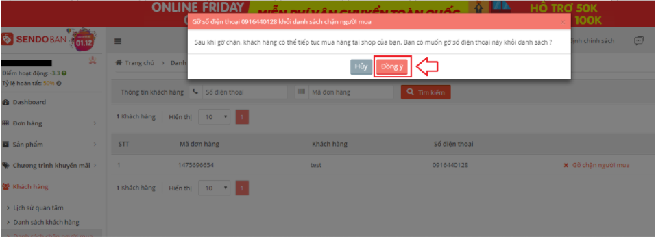 + Sau đó “pop up” hiện lên và bạn nhấn đồng ý để được hoàn tất việc gỡ chặn khách hàng. Người dùng này sẽ vẫn tiếp tục đặt và mua hàng tại shop bình thường.