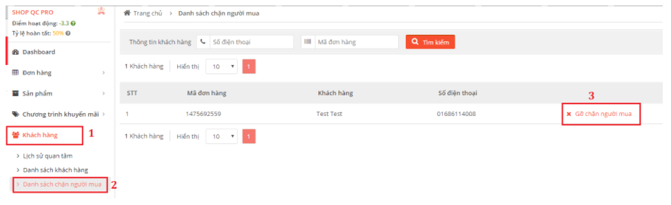 + Số điện thoại bị chặn sẽ được đưa vào danh sách đen của Shop. Người mua sẽ không thể tiếp tục mua hàng của Shop trong tương lai.