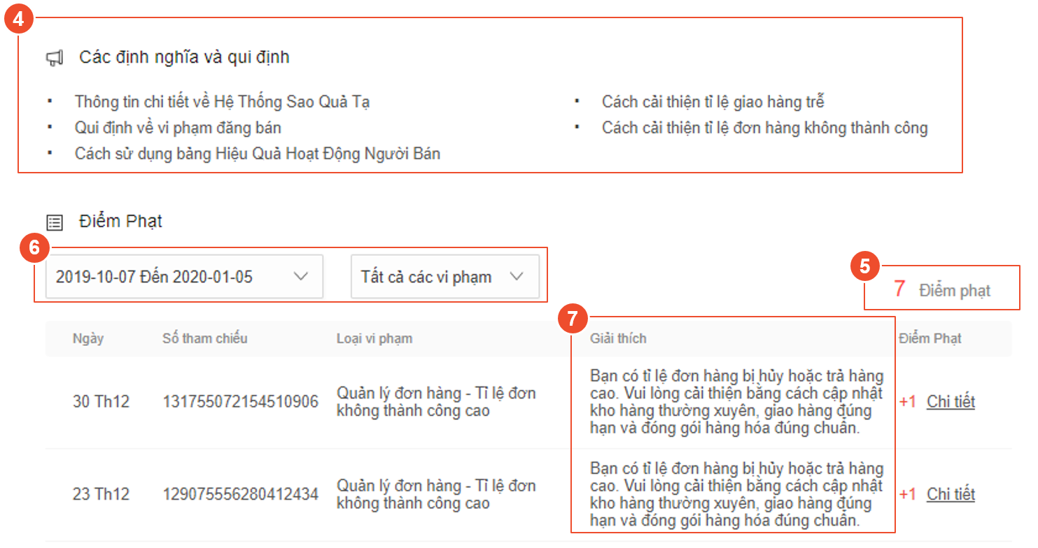- Phạt 6 điểm không được tham gia chương trình khuyến mãi, ngừng hỗ trợ vận chuyển và ẩn tất cả các danh sách khỏi trình duyệt.