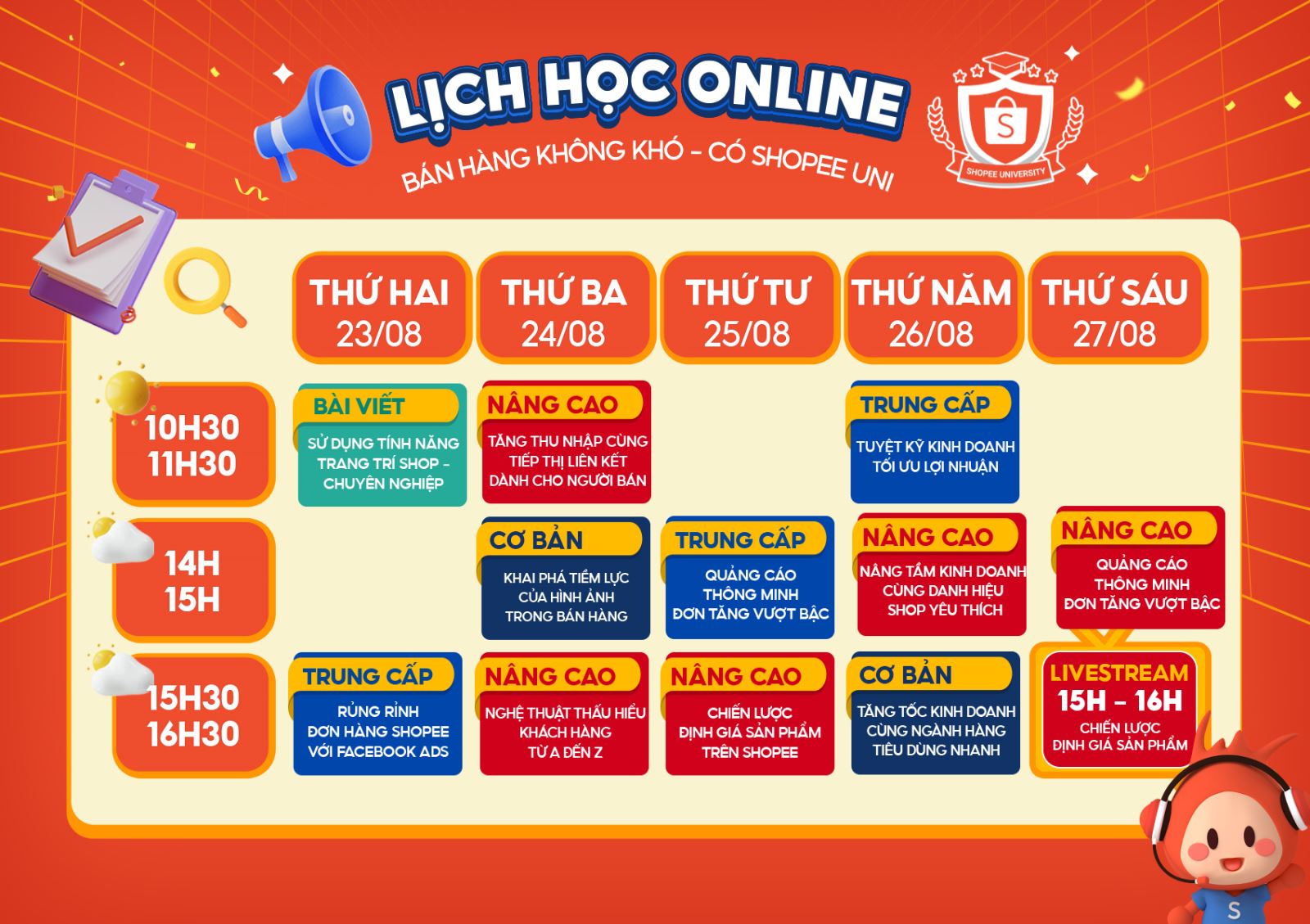 Lớp học Online thuộc chương trình đào tạo bán hàng của Shopee Uni. Với sự hỗ trợ của đội ngũ nhân viên Shopee và các chủ đề đa dạng, lớp học sẽ cung cấp cho Shop những kiến thức, quy định bán hàng từ Shopee. Lịch học online sẽ như sau: