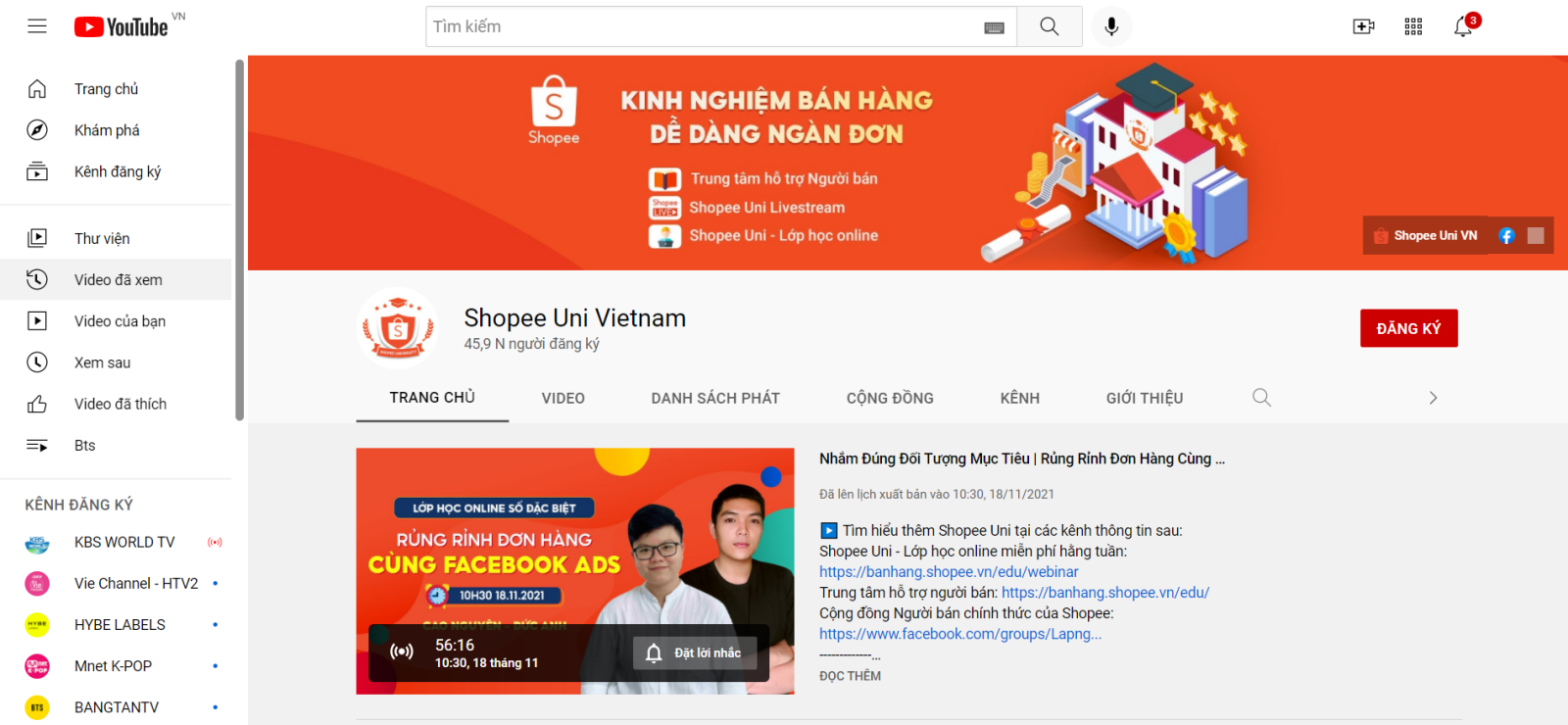 Youtube Shopee Uni - là kênh Youtube chính thức của học viện Shopee Uni. Kênh thông tin này sẽ cung cấp cho người bán những video miễn phí về hướng dẫn các mẹo/bí kíp bán hàng trên Shopee cùng các chuyên gia và Người bán có kinh nghiệm.