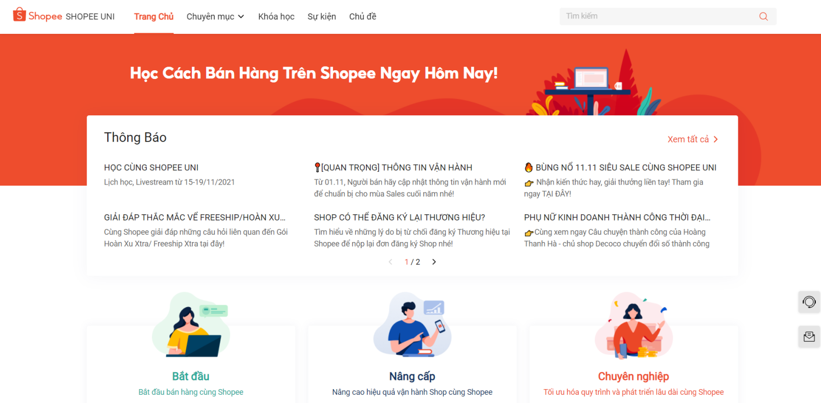 Học viện Shopee là Website cung cấp kiến thức dành cho Người bán. Người bán có thể nắm bắt những quy định và tính năng mới, đồng thời học thêm về bí kíp bán hàng và theo dõi các sự kiện nổi bật tại đây.