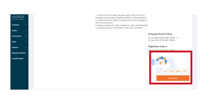 Để được tham gia các chiến dịch mua sắm lớn trên Lazada, Các nhà bán cần phải đạt được một số điều kiện theo tiêu những tiêu chuẩn như: Đánh giá nhà bán hàng, hiệu suất kinh doanh của những chiến dịch trước, hiệu suất hoạt động hằng ngày… Nếu đủ điều kiện tham gia thì người bán sẽ có một lời mời tham gia khuyến mãi sắn có.