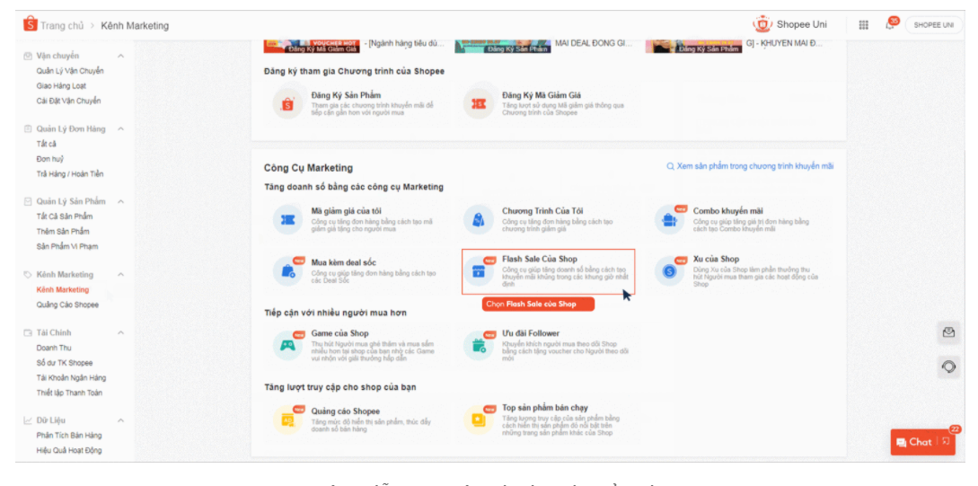 Bước 1: Đầu tiên bạn truy cập vào kênh marketing tại kênh người bán và chọn Flash Sale của shop.