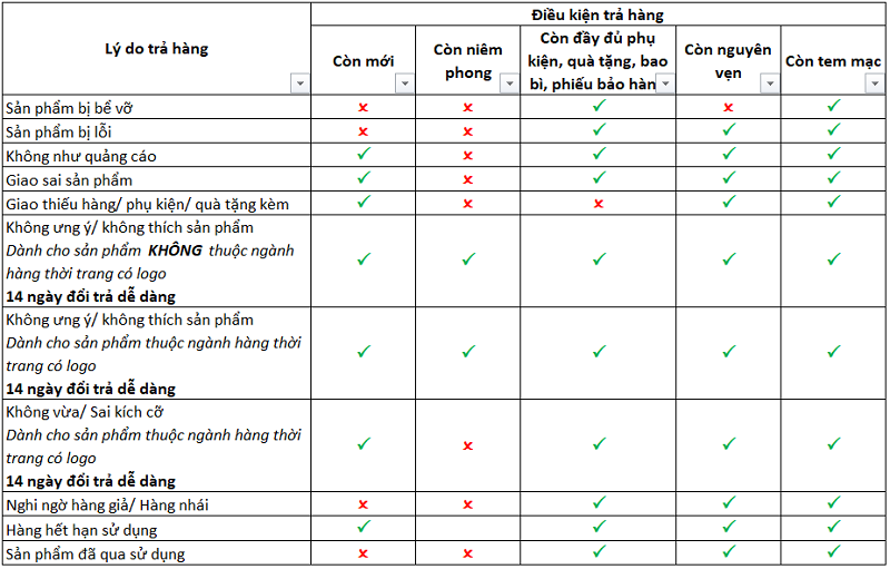 Tùy từng lý do đổi trả hàng khác nhau mà người mua cần phải thỏa mãn các điều kiện khác nhau: