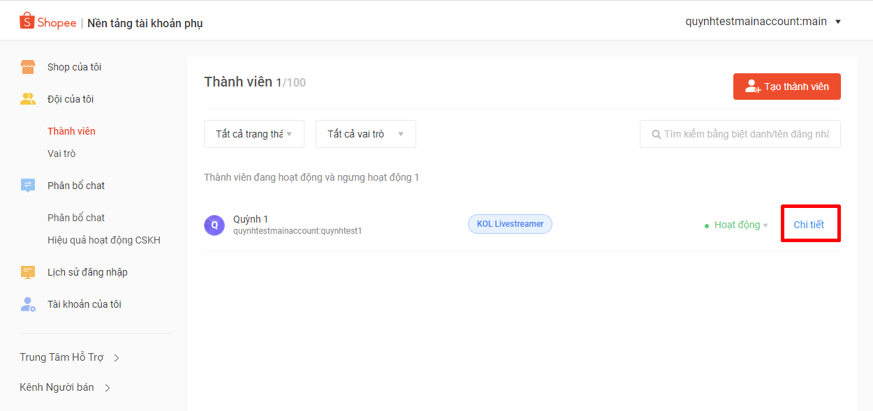 Mỗi tài khoản phụ khi đăng nhập vào Kênh Người Bán sẽ chỉ hiển thị những phần được tài khoản chính phân quyền
