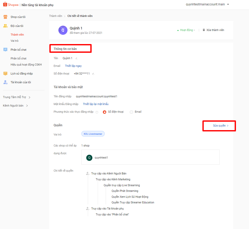 Bước 5: Chỉnh sửa các thông tin, vai trò và quyền truy cập của thành viên vào Shop sau khi đã kích hoạt Tài khoản phụ