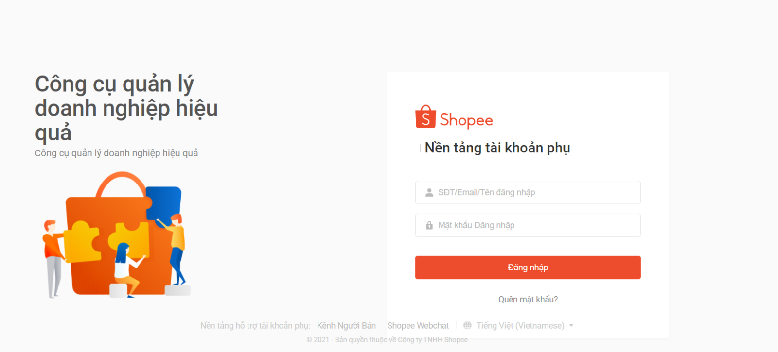 Bước 1: Đăng nhập vào nền tảng tài khoản phụ bằng tài khoản bạn vừa tạo mới tại https://subaccount.shopee.com/login/