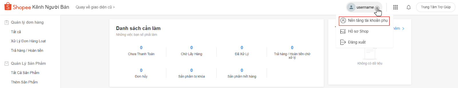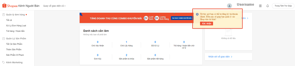 Đây là một tính năng chọn lọc nên chỉ tài khoản bán hàng nào nhận được thông báo trên Kênh người bán mới được áp dụng. Sau đó nền tảng tài khoản phụ đã hiển thị dưới tên đăng nhập, bấm chọn để bắt đầu đăng ký.