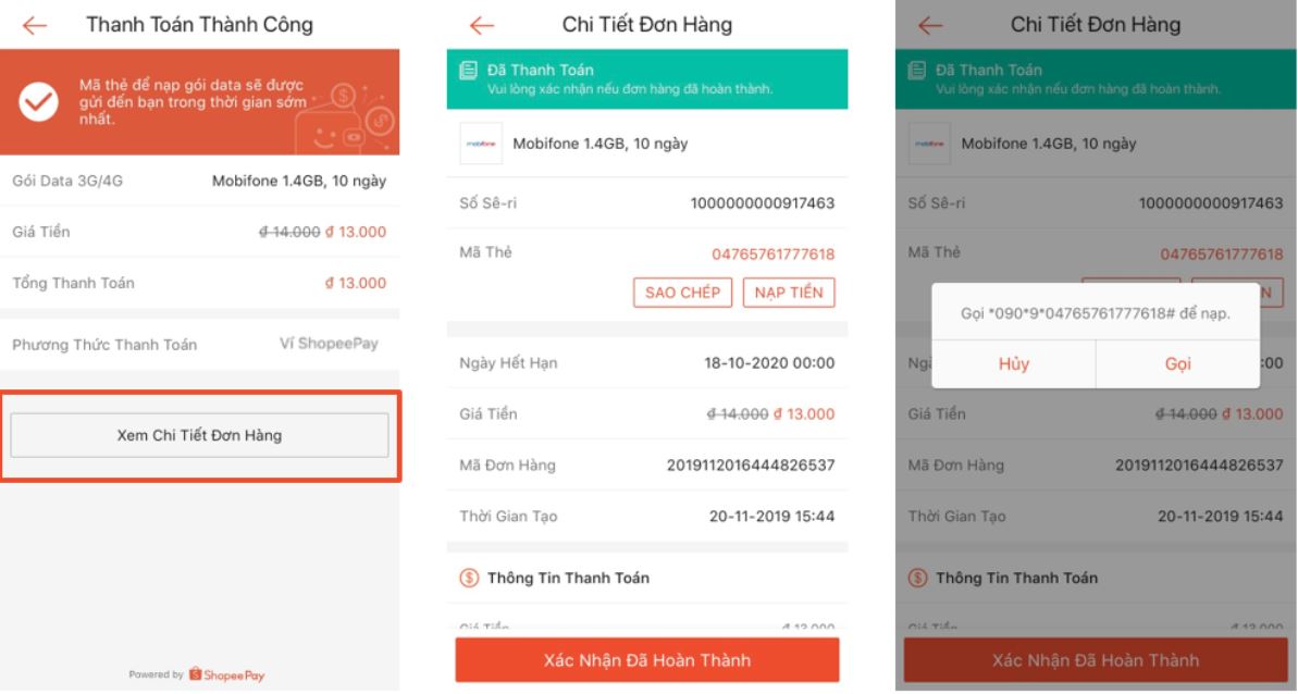 Bước 5: Nạp gói data vừa mua bằng cách bấm Xem chi tiết đơn hàng ngay sau khi thanh toán thành công hoặc vào mục Tôi => Đơn Nạp thẻ & Dịch Vụ => Đã thanh toán => Nạp tiền điện thoại => chọn gói data cần nạp
