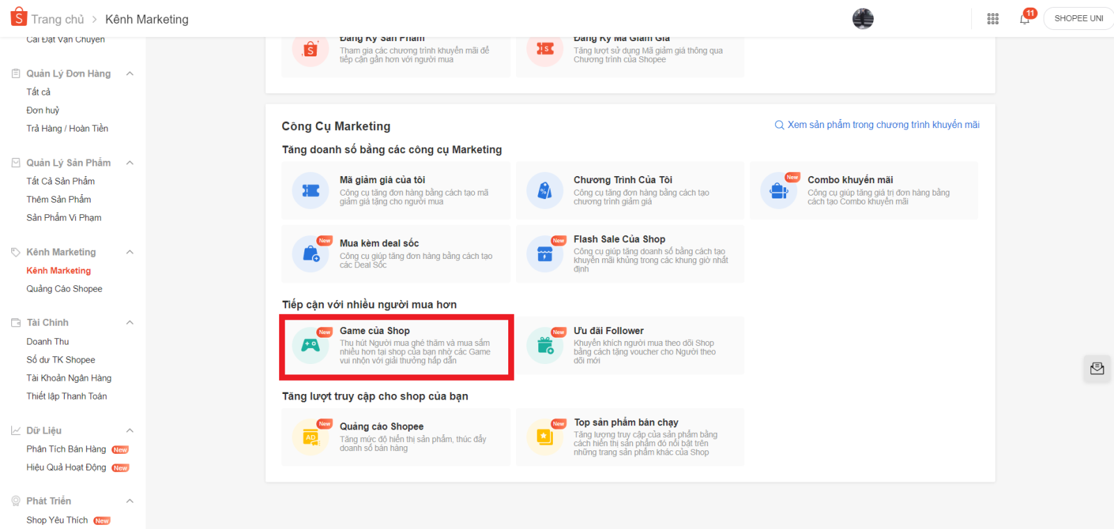Bước 1: Truy cập Kênh Marketing tại Kênh Người bán => chọn Game của Shop