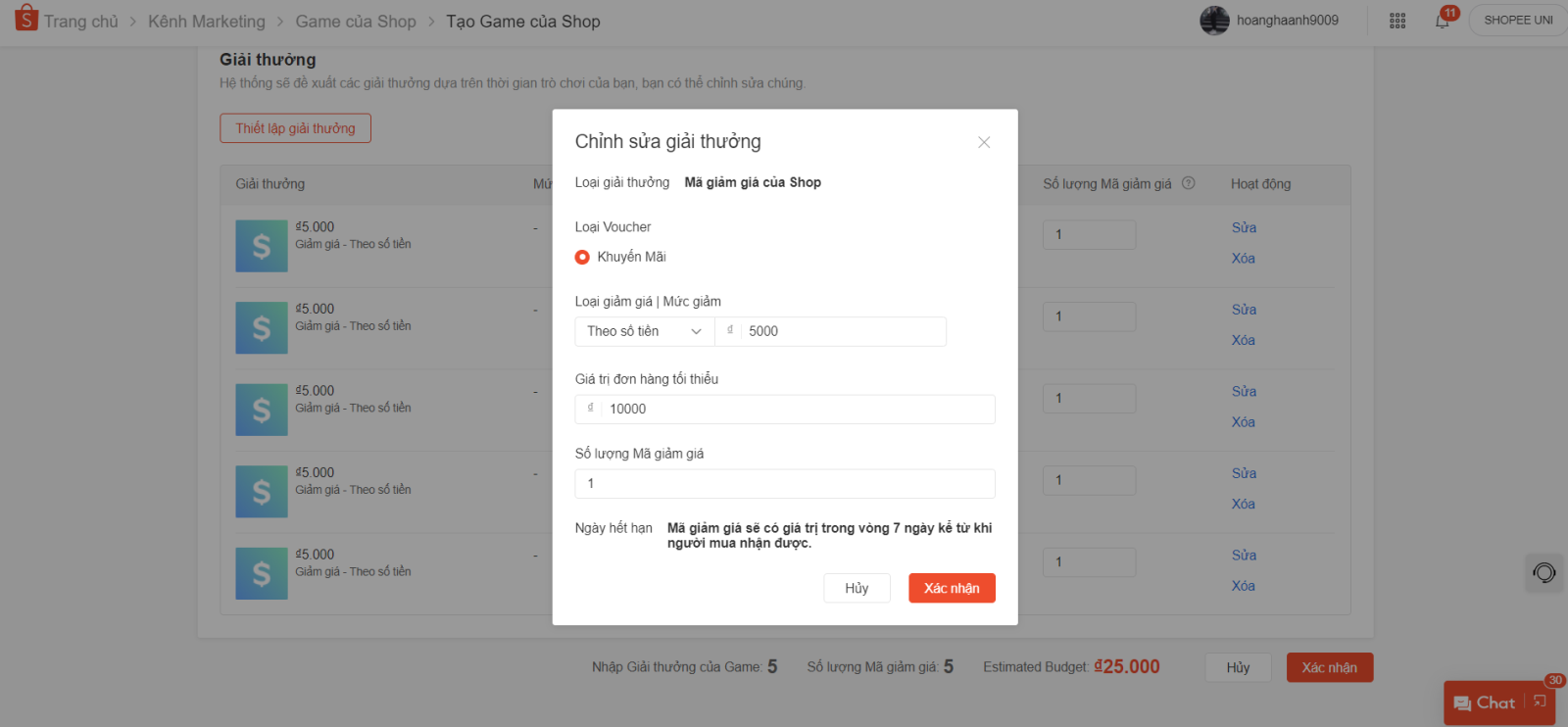 - Sau khi thiết lập giải thưởng, hệ thống sẽ tự động đề xuất giải thưởng dựa trên thời gian diễn ra Game, Shop có thể tùy chỉnh lại.