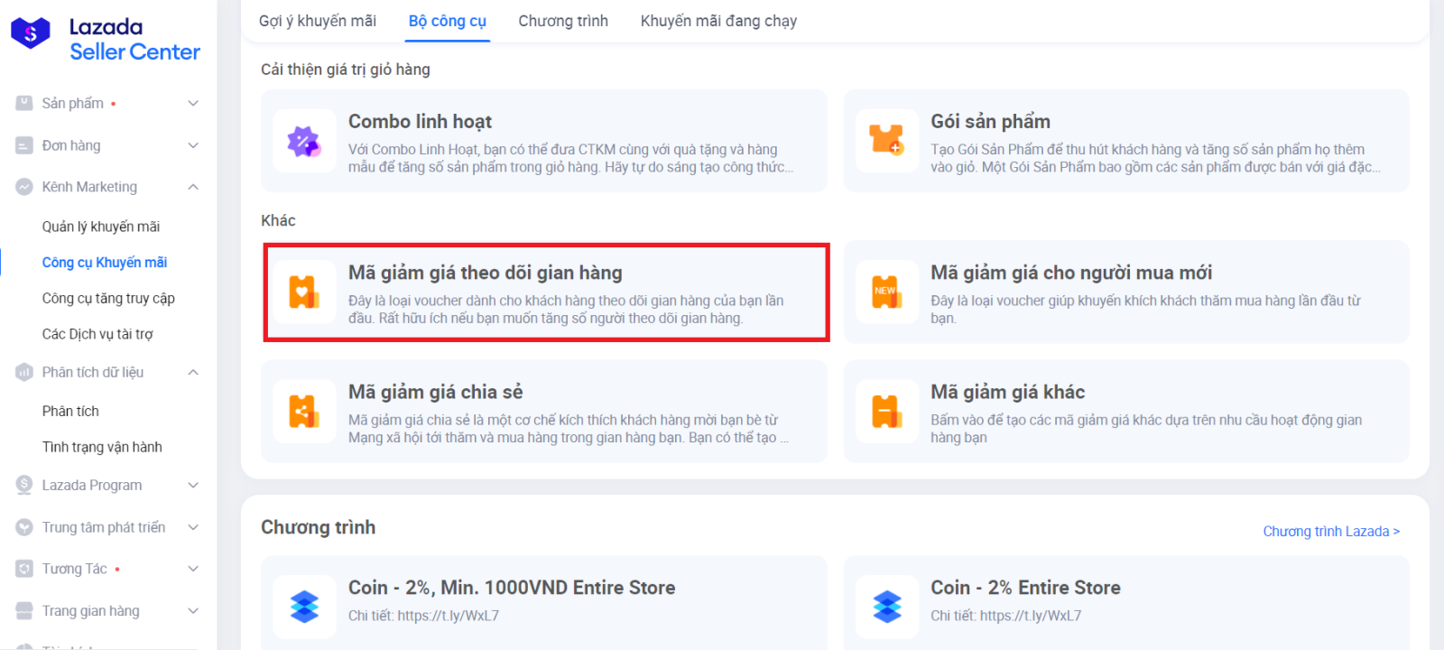 Bước 1: Truy cập vào Lazada Seller Centre của bạn => chọn mục Công cụ khuyến mãi và chọn Mã giảm giá theo dõi gian hàng.