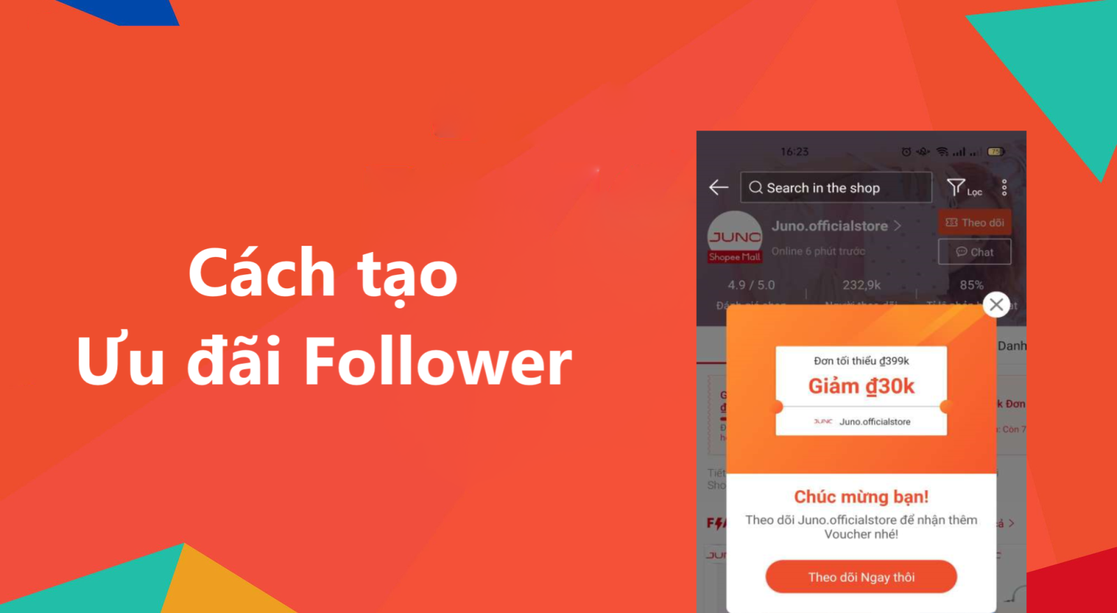 Ưu đãi follower là một công cụ marketing của Shopee. Với công cụ này một mã giảm giá và một nút theo dõi sẽ tự động hiện ra ngay khi người mua vào gian hàng của shop trong thời gian ưu đãi follower diễn ra và mã giảm giá này sẽ là yếu tố khuyến khích và thúc đẩy người mua nhấn follow cho shop từ đó dễ dàng nhận được các thông tin sản phẩm, chương trình khuyến mãi mới nhất.