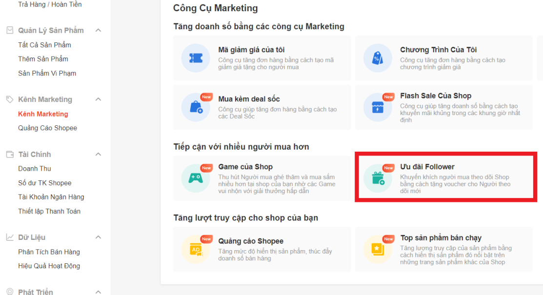 Bạn hãy làm theo các bước dưới đây để có thể tạo Ưu đãi Follower cho shop của mình trên Shopee.