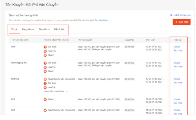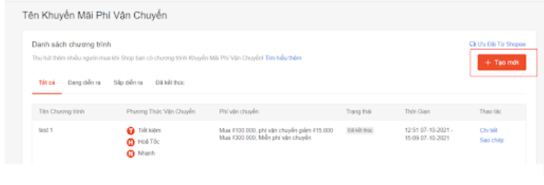 Sau khi thiết lập xong, Khuyến mãi phí vận chuyển sẽ hiển thị trên trang Danh sách chương trình. Người bán có thể tìm kiếm các chương trình theo trạng thái Đang diễn ra/ Sắp diễn ra/ Đã kết thúc và thực hiện chỉnh sửa hoặc kết thúc chương trình tại cột Thao tác.