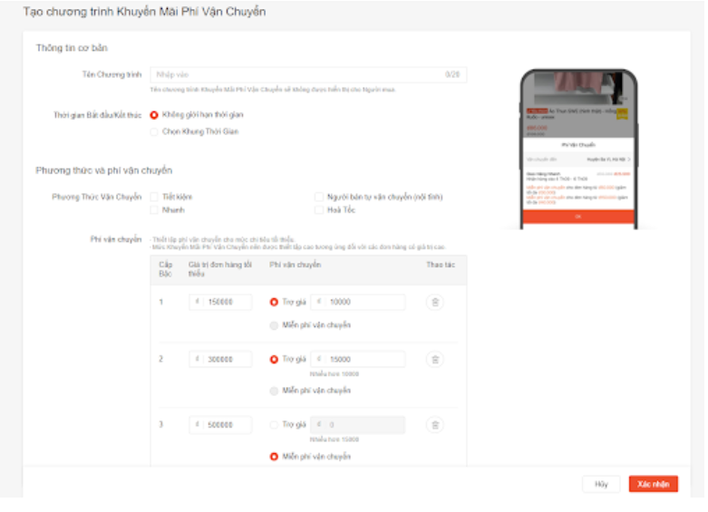 Bạn cũng có thể thêm hoặc xóa các mức khuyến mãi phí vận chuyển, tối đa là 3 mức.