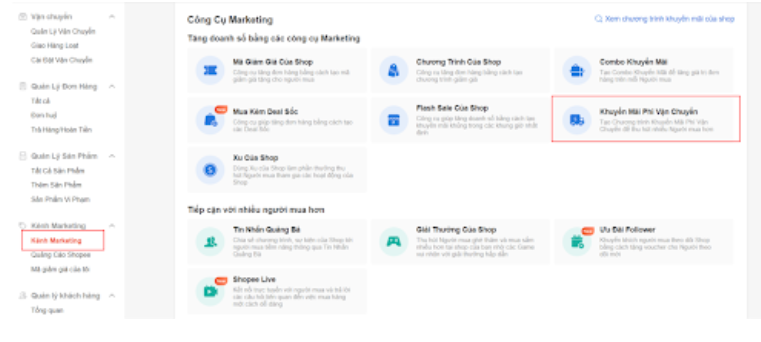 Bước 2: Tại mục công cụ marketing >> Chọn khuyến mãi phí vận chuyển.