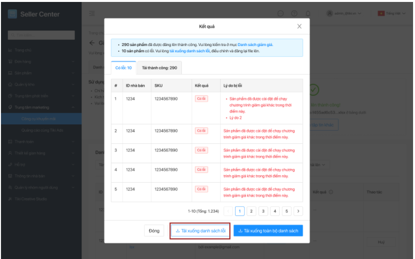 Bước 5: Cuối cùng bạn cần kiểm tra kết quả danh sách sản phẩm mã giảm giá khi tải lên theo các mục sau đây: