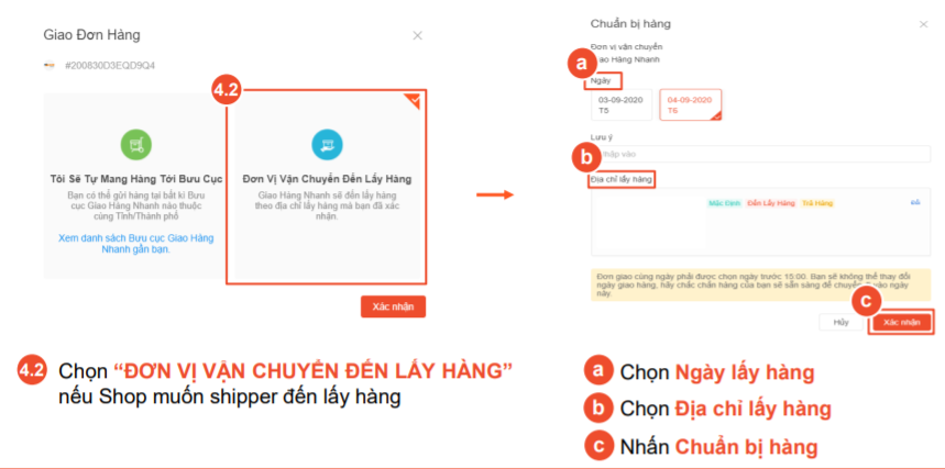 Chọn “Đơn vị vận chuyển đến lấy hàng”. Hãy điền đầy đủ các thông tin ngày lấy hàng, địa chỉ lấy hàng và nhấn xác nhận.