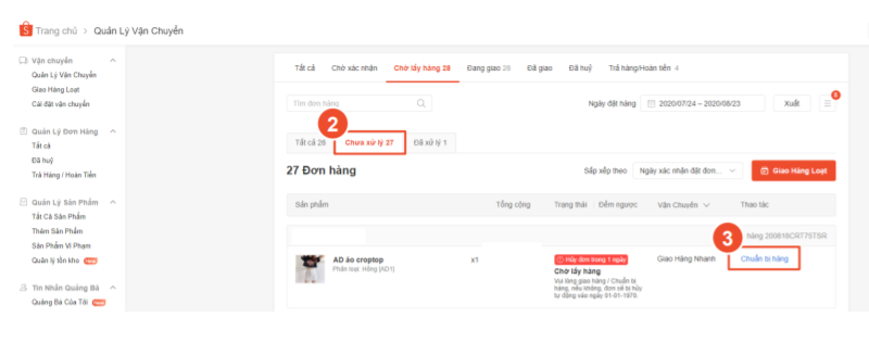 Bước 3: Tại đây sẽ hiện ra đơn lẻ cần bạn xử lý, bạn cần nhấn vào chuẩn bị hàng để chọn hình thức giao hàng cho vận chuyển.
