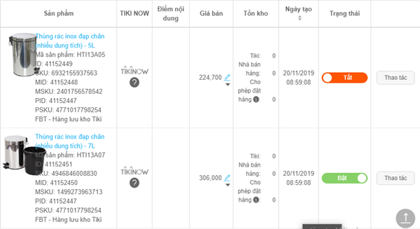 Bước 3: Khi màn hình hiển thị các sản phẩm bạn đang bán bạn có thể thực hiện bằng cách click vào thao tác. Tuy nhiên bạn có thể thấy rằng hệ thống Tiki không cho nhà bán xóa trực tiếp sản phẩm. Bạn có thể tắt sản phẩm bạn không muốn bán trên Tiki nữa để người có thể tránh và biết được khi mua hàng trên Tiki.