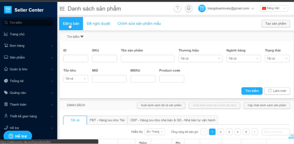 Bước 1: Đầu tiên truy cập trang Tiki Seller Center >> chọn sản phẩm >> Danh sách sản phẩm >> Đăng bán.
