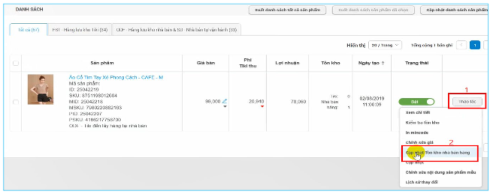 Bước 2: Tiếp theo bạn cần chọn sản phẩm cần chỉnh tồn kho, sau đó bấm vào mục Thao tác. Tại đây sẽ hiển thị các lệnh và bạn click vào mục cập nhật tồn kho nhà bán hàng trên giao diện.
