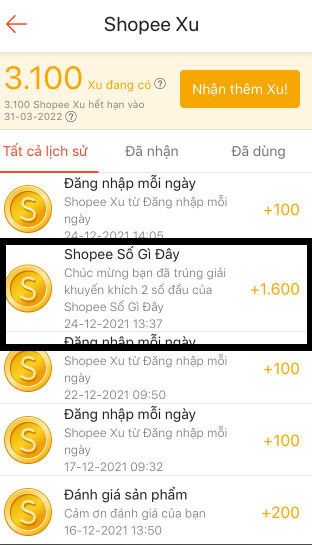 Chọn số xu bạn đang có để truy cập vào lịch sử Shopee xu. Tại đây bạn sẽ thấy số xu được công từ giải thưởng shopee Xu.