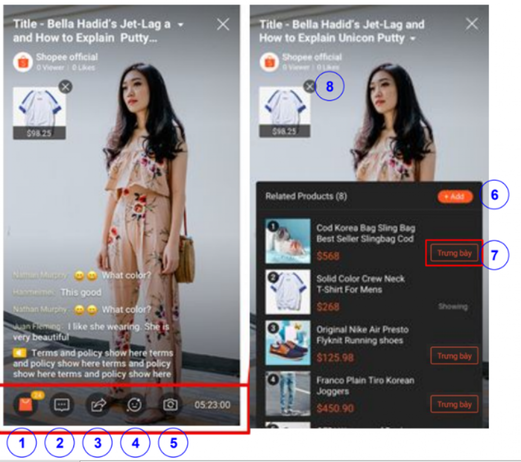 (4) Thêm sản phẩm liên quan: là mục để bạn thêm sản phẩm mà bạn muốn bán trong livestream có trong Shop của bạn trên Shopee.