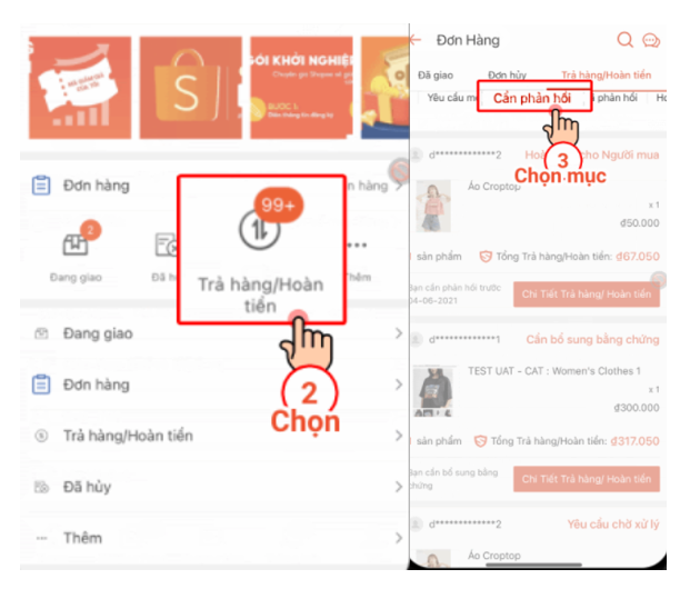 Bước 2: Tại mục trả hàng hoàn tiền >> Bạn nhấn vào “Cần phản hồi “