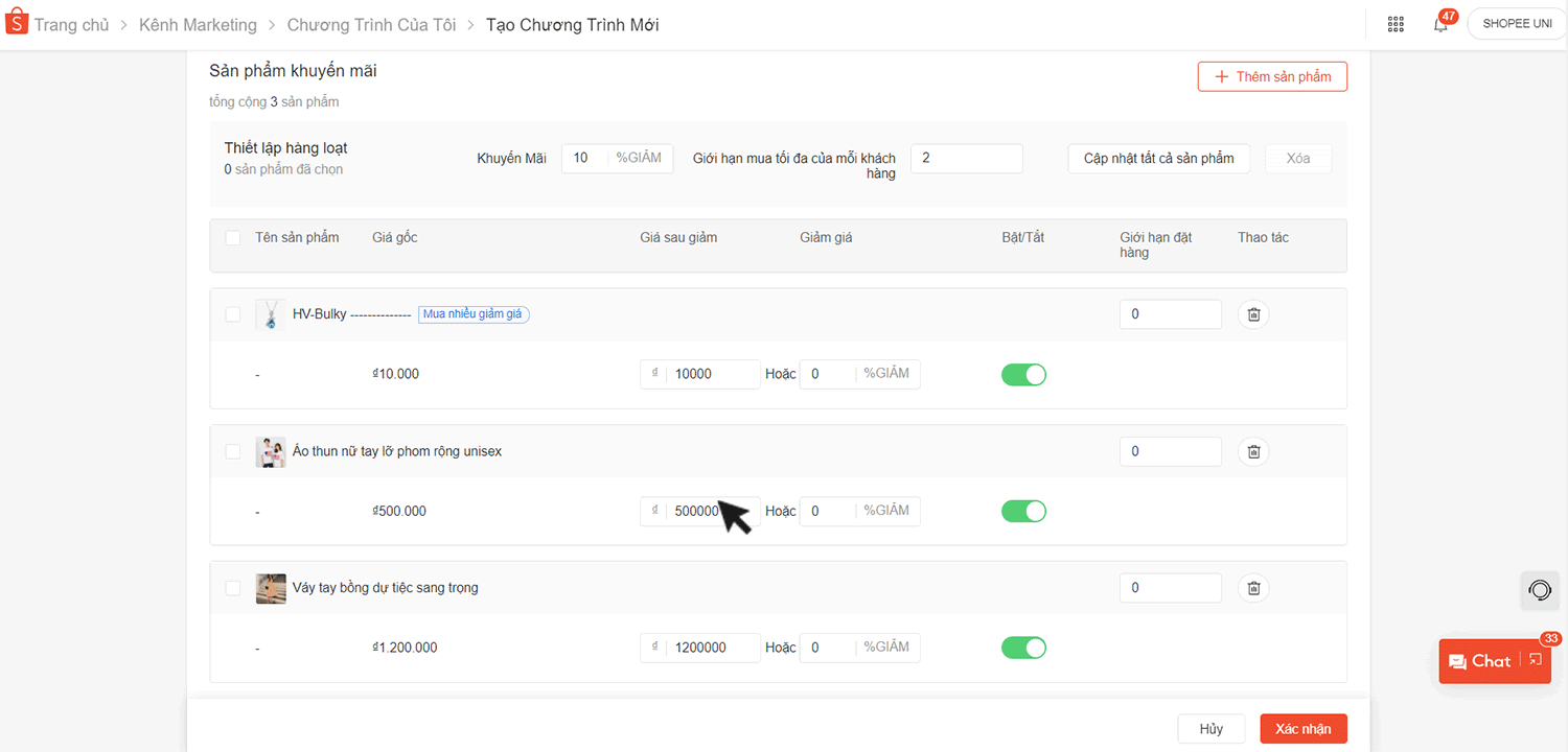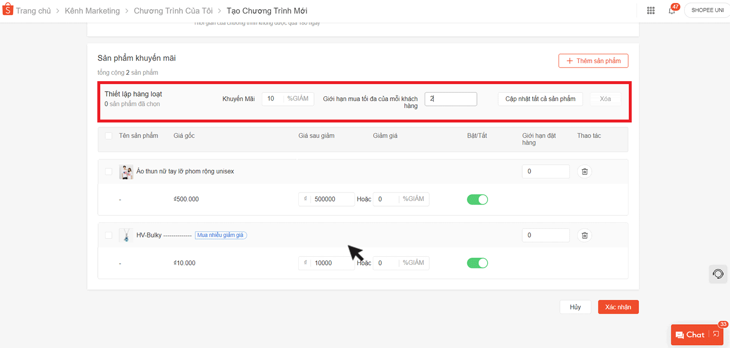 Tại Thiết lập hàng loạt, điền phần trăm Khuyến mãi và Giới hạn mua tối đa của mỗi khách hàng. Kiểm tra lại các sản phẩm áp dụng chương trình, và chọn Cập nhật các sản phẩm được chọn.