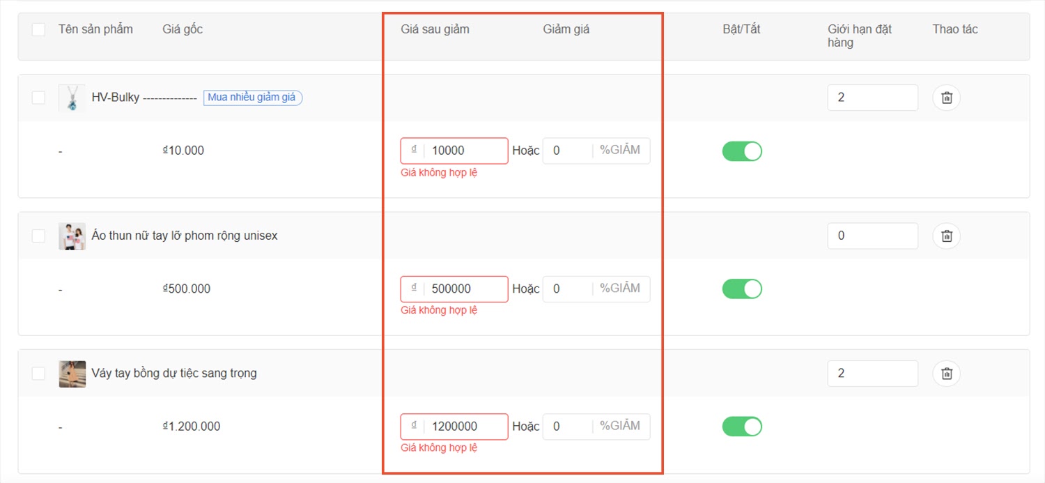 Tại Thiết lập hàng loạt, bạn hãy điền phần trăm Khuyến Mãi, Giới hạn mua tối đa của mỗi khách hàng và chọn Cập nhật tất cả sản phẩm.