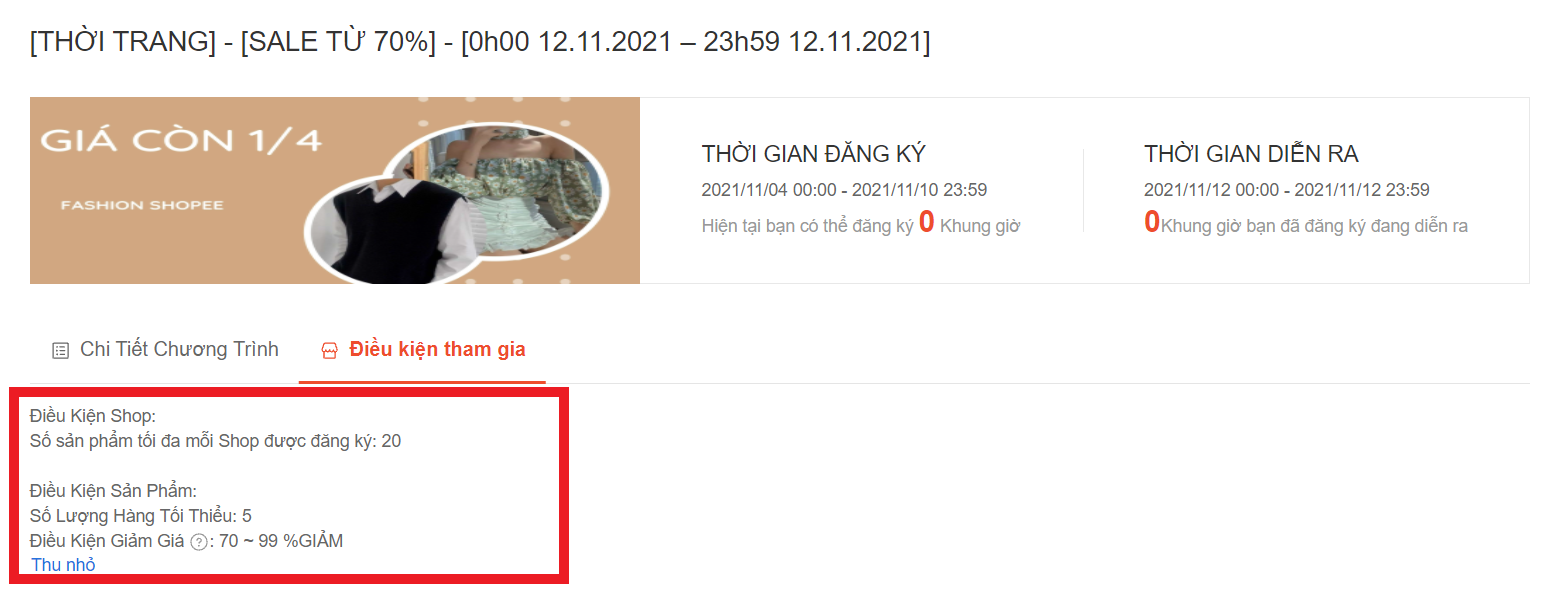 Thứ hai, mỗi chương trình sẽ có những điều kiện tham gia riêng, bạn hãy nhấn vào xem chi tiết để xem sản phẩm của mình có thể đáp ứng được hay không.