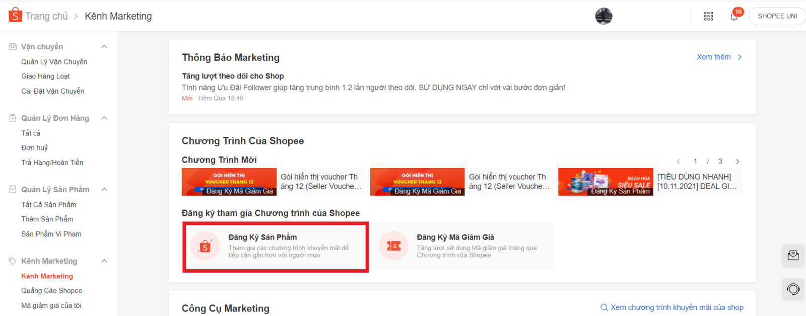 Bước 1: Truy cập vào Kênh người bán => Chọn Kênh marketing => trong mục Chương trình của Shop, bạn chọn Đăng ký sản phẩm