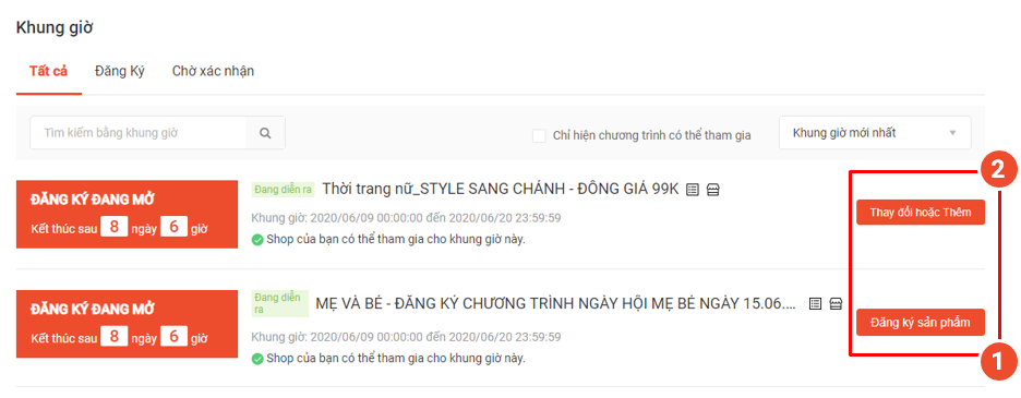 1. Nếu khung giờ chưa có sản phẩm nào đăng ký tham gia từ trước sẽ hiện nút Đăng Ký sản phẩm