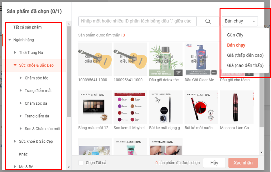 Bước 4: Một bảng sản phẩm của shop sẽ hiện lên và bạn có thể chọn sản phẩm tham gia. Bạn có thể chọn menu thả để lọc sản phẩm theo tiêu chí Shop cần. Cuối cùng Chọn Xác nhận để lưu lại các sản phẩm đã chọn.