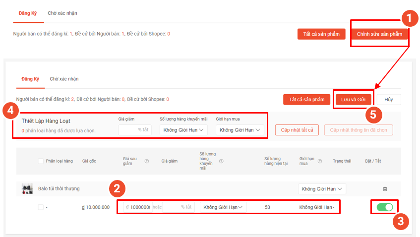 Bước 5: Thiết lập thông tin giảm giá cho các sản phẩm tham gia rồi nhấn Lưu và Gửi.