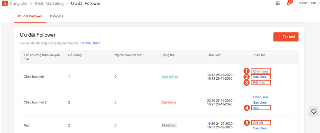Để quản lý các chương trình ưu đãi Follower hiệu quả, bạn cần phải theo dõi danh sách các chương trình khuyến mãi đang diễn ra, sắp diễn ra và đã kết thúc bằng cách truy cập vào kênh người bán => chọn Kênh Marketing, cuối cùng chọn Ưu đãi Follower và ngay tại giao diện, bạn có thể theo dõi các chương trình của mình.