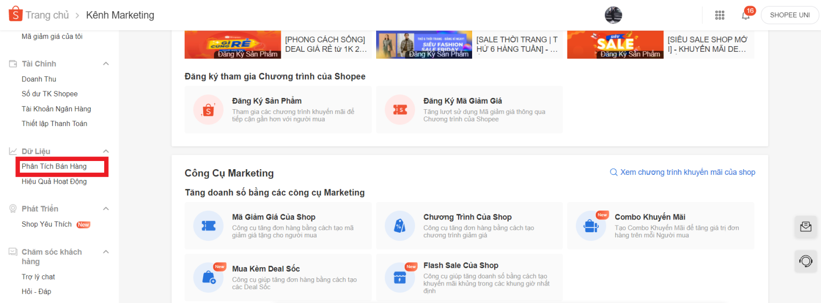 Bước 1: Truy cập vào Kênh người bán => trong mục Dữ liệu, bạn chọn Phân tích bán hàng