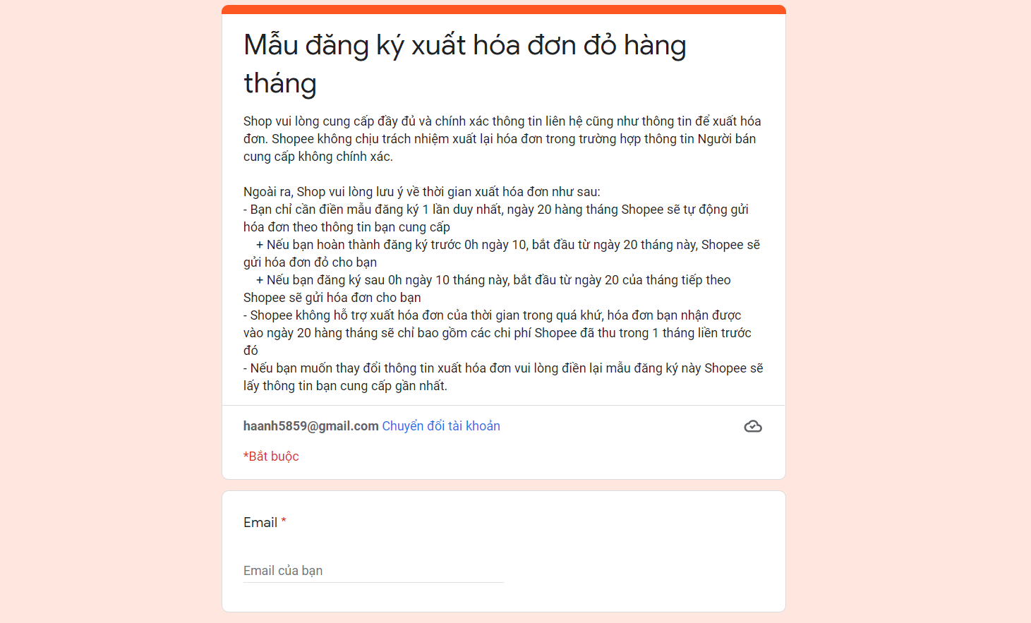 - Bạn chỉ cần điền mẫu đăng ký 1 lần duy nhất, ngày 20 hàng tháng Shopee sẽ tự động gửi hóa đơn theo thông tin bạn cung cấp.