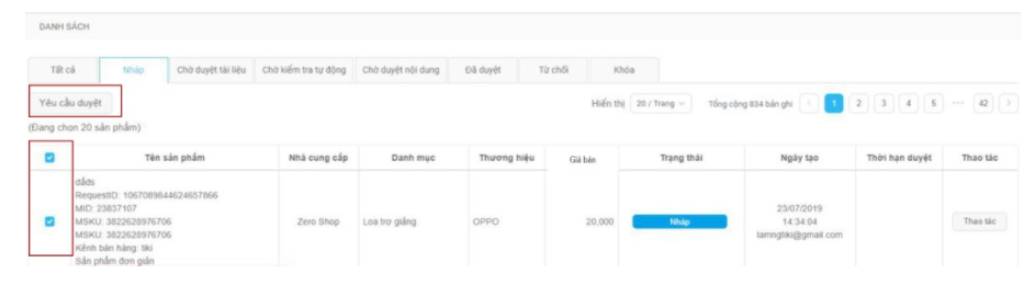Bước 2: Chọn các sản phẩm cần yêu cầu duyệt >> Yêu cầu duyệt.
