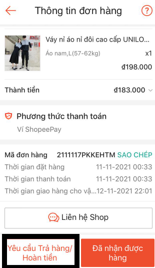 Bước 1: Gửi yêu cầu trả hàng hoàn tiền trên Shopee