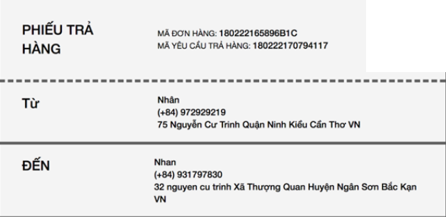 Ảnh hóa đơn trả hàng thấy rõ các thông tin: mã vận đơn, người gửi, người nhận ( Tên, địa chỉ và số điện thoại) và ảnh gói hàng gửi hoàn trả.