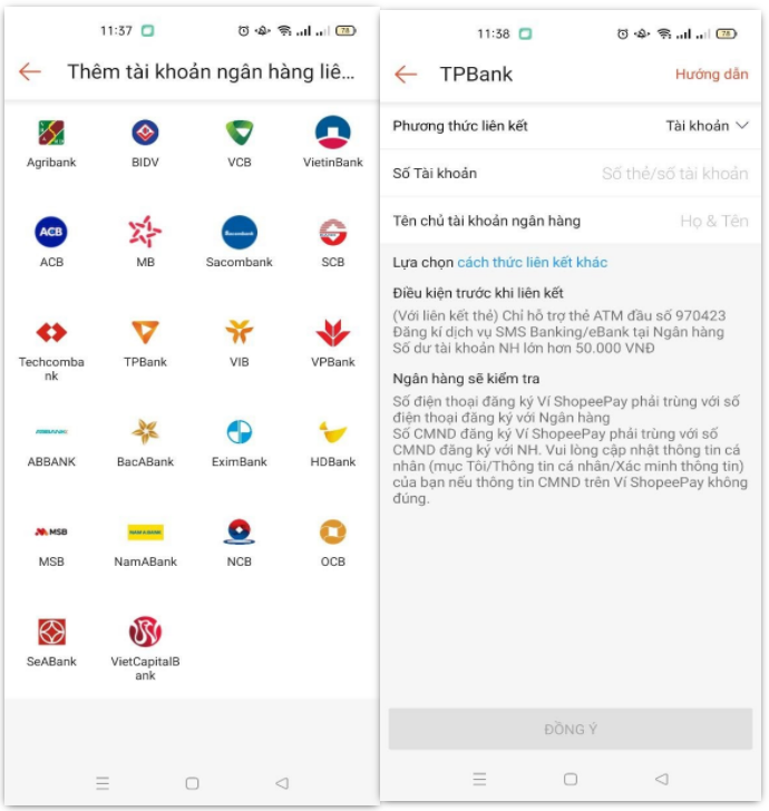 Bước 6: Chọn phương thức liên kết Tài Khoản, nhập số tài khoản ngân hàng hoặc số thẻ ngân hàng và nhấn ĐỒNG Ý